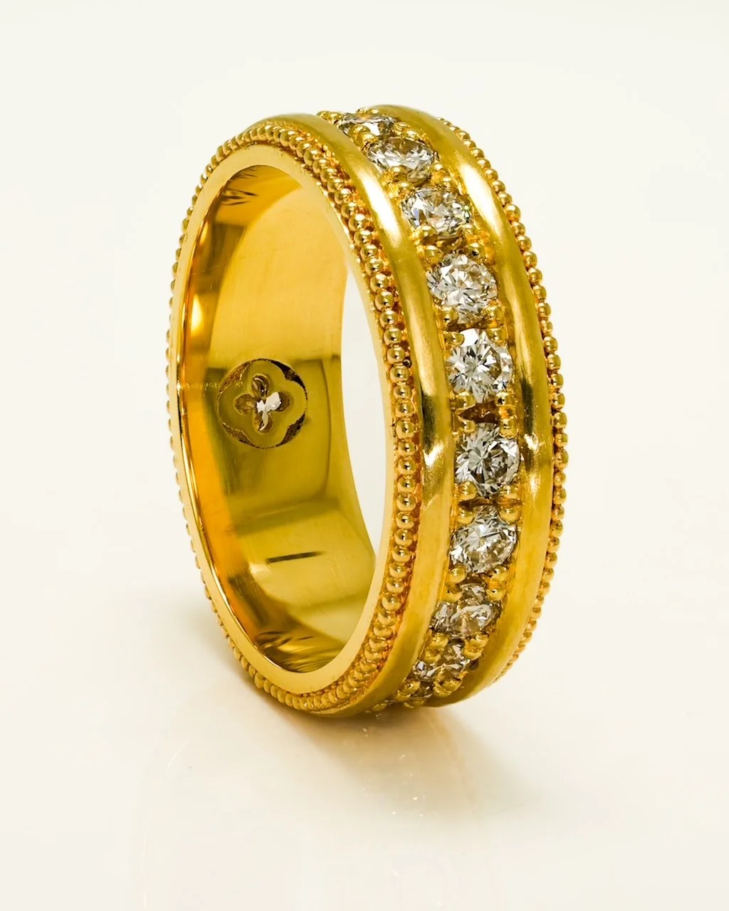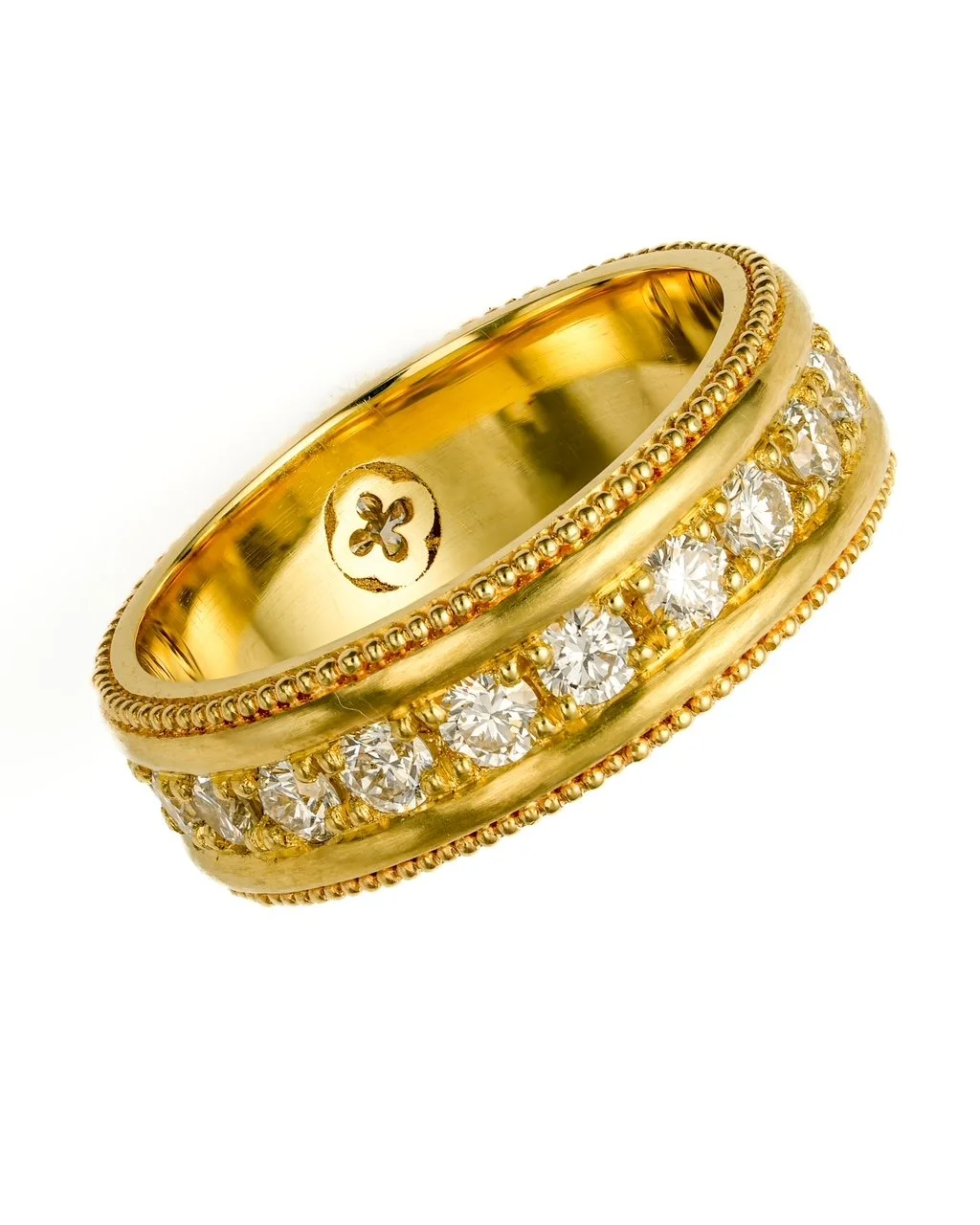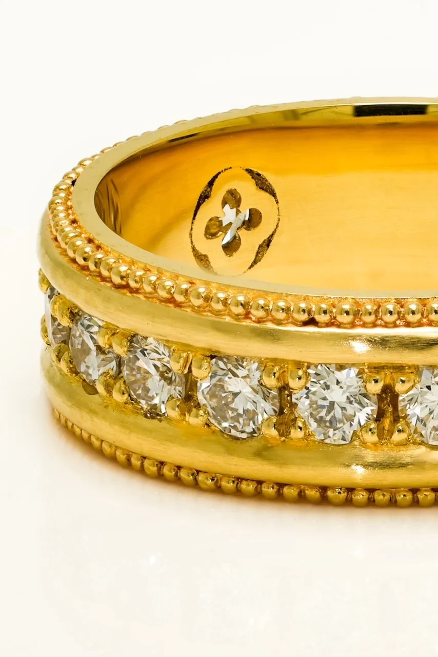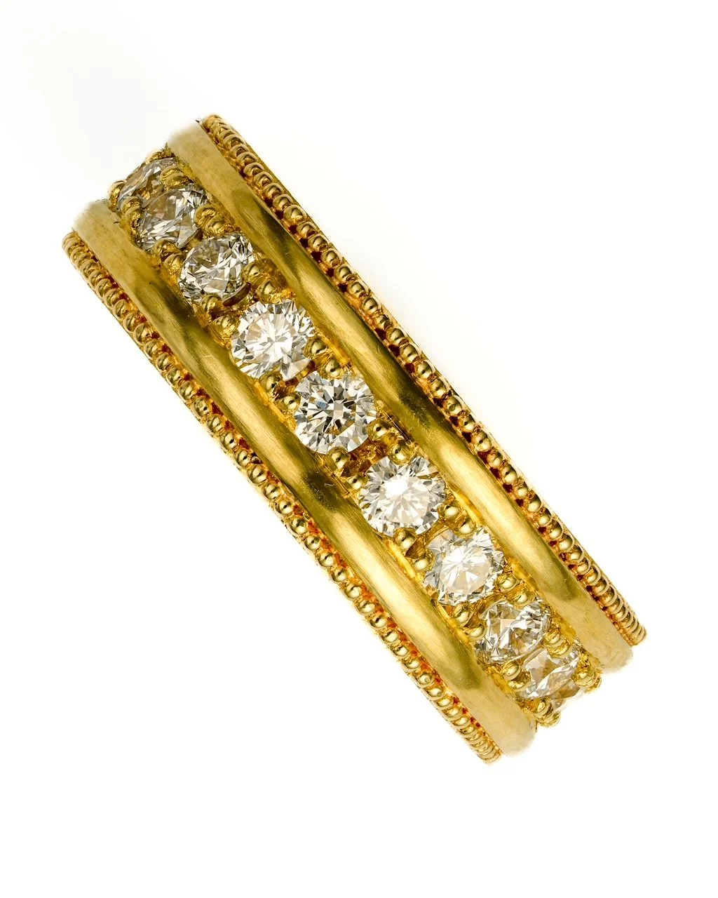 A full eternity ring in solid 18k gold, set with precision-cut diamonds and finished with fine granulated edges.