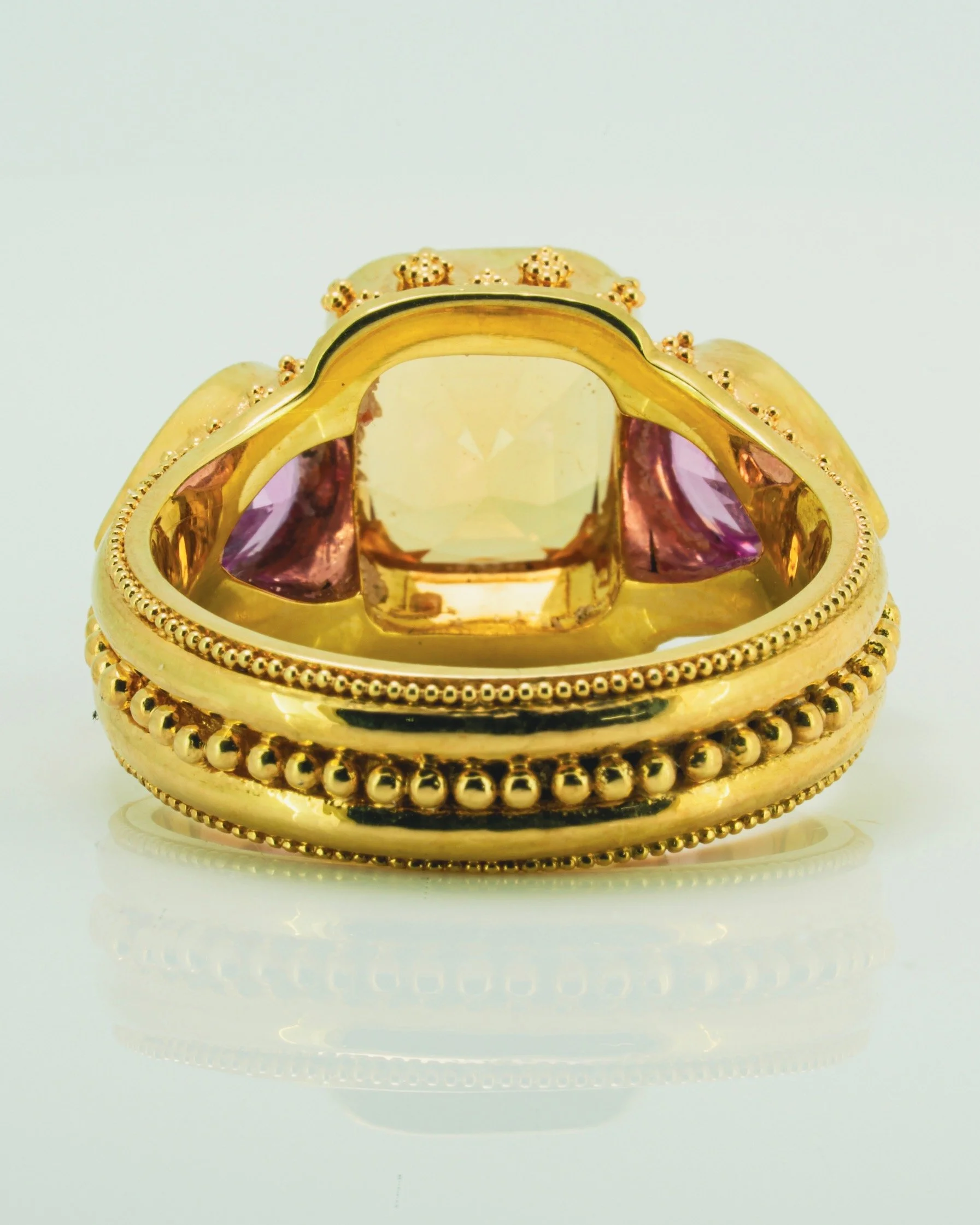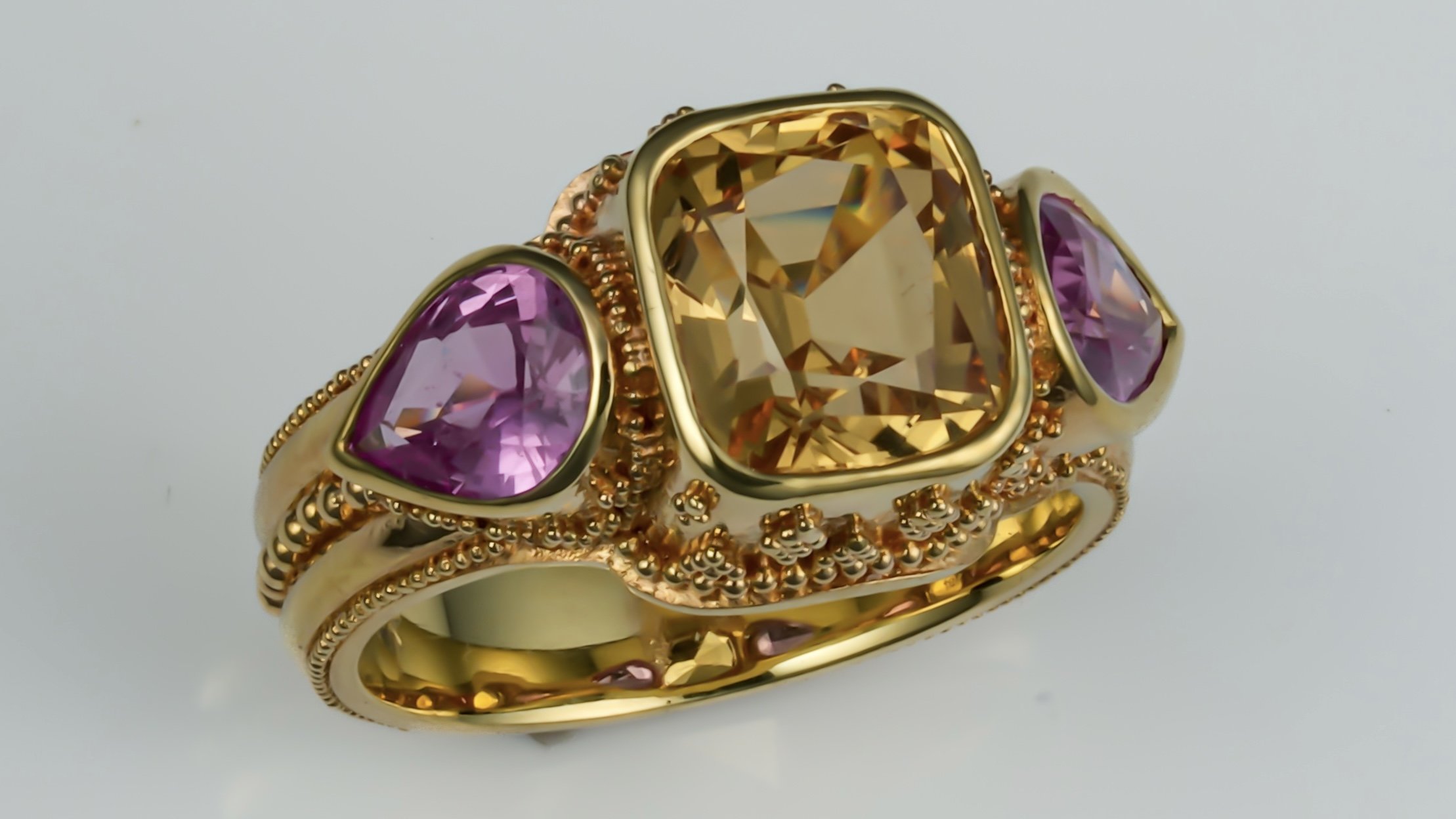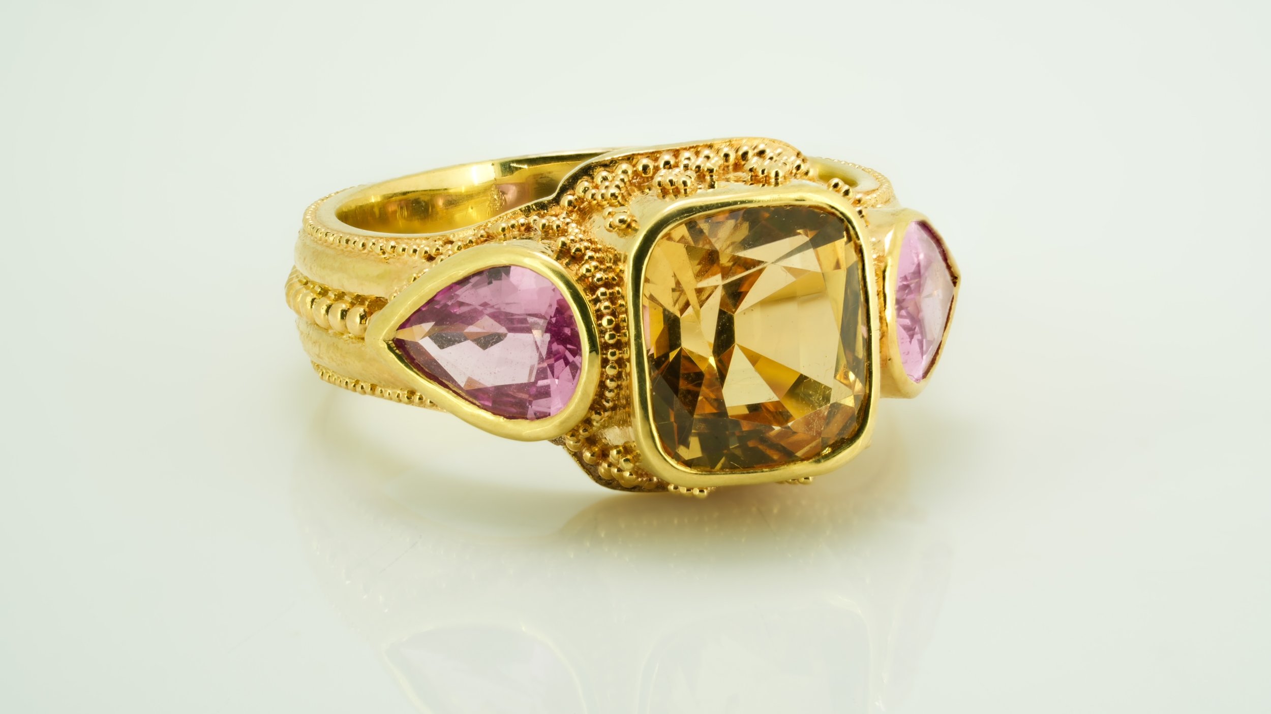 The imperial topaz sits warm and deep in tone, contrasted by two pink sapphires that shift subtly in different light.