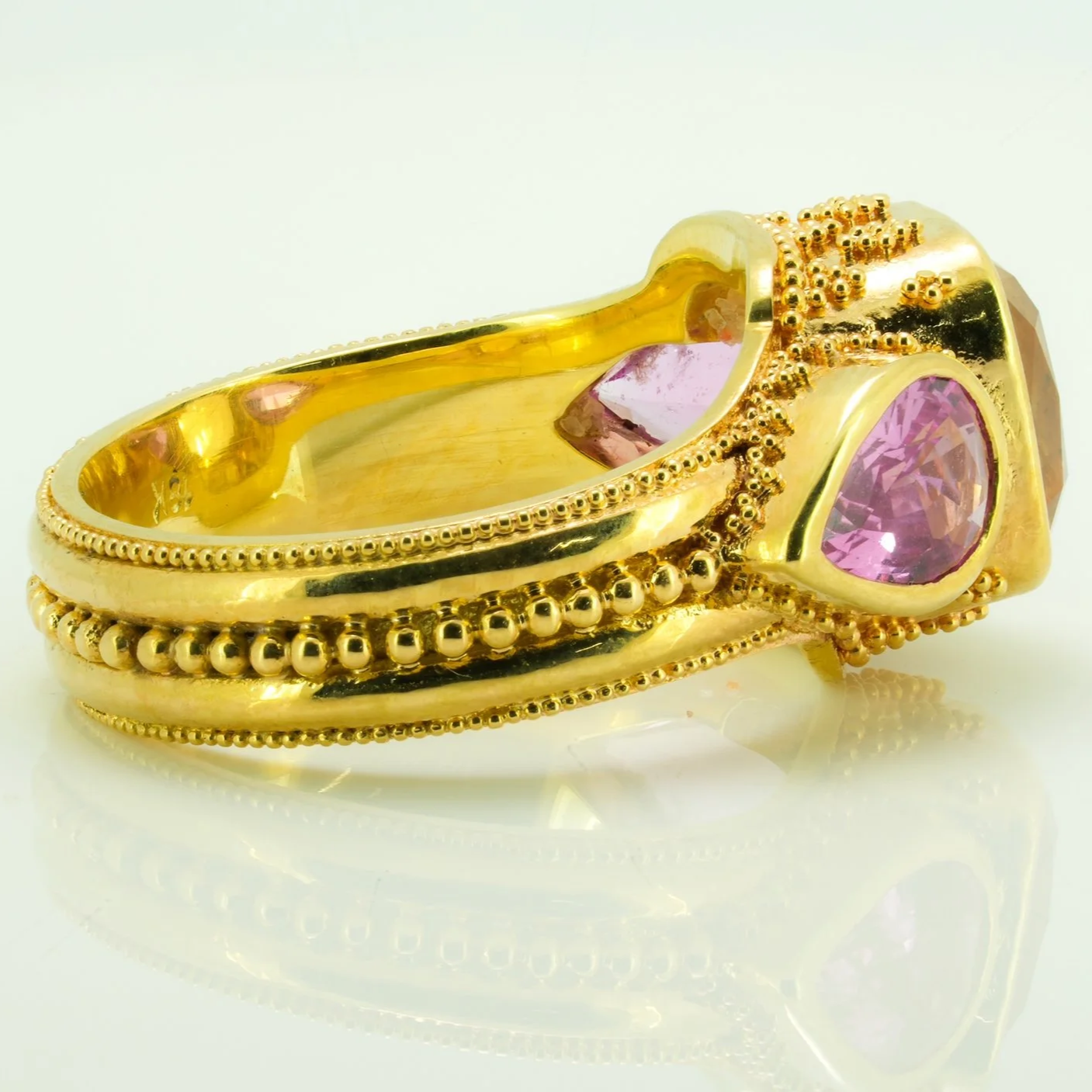 A richly coloured imperial topaz set in solid 18k gold, framed by two pink sapphires.