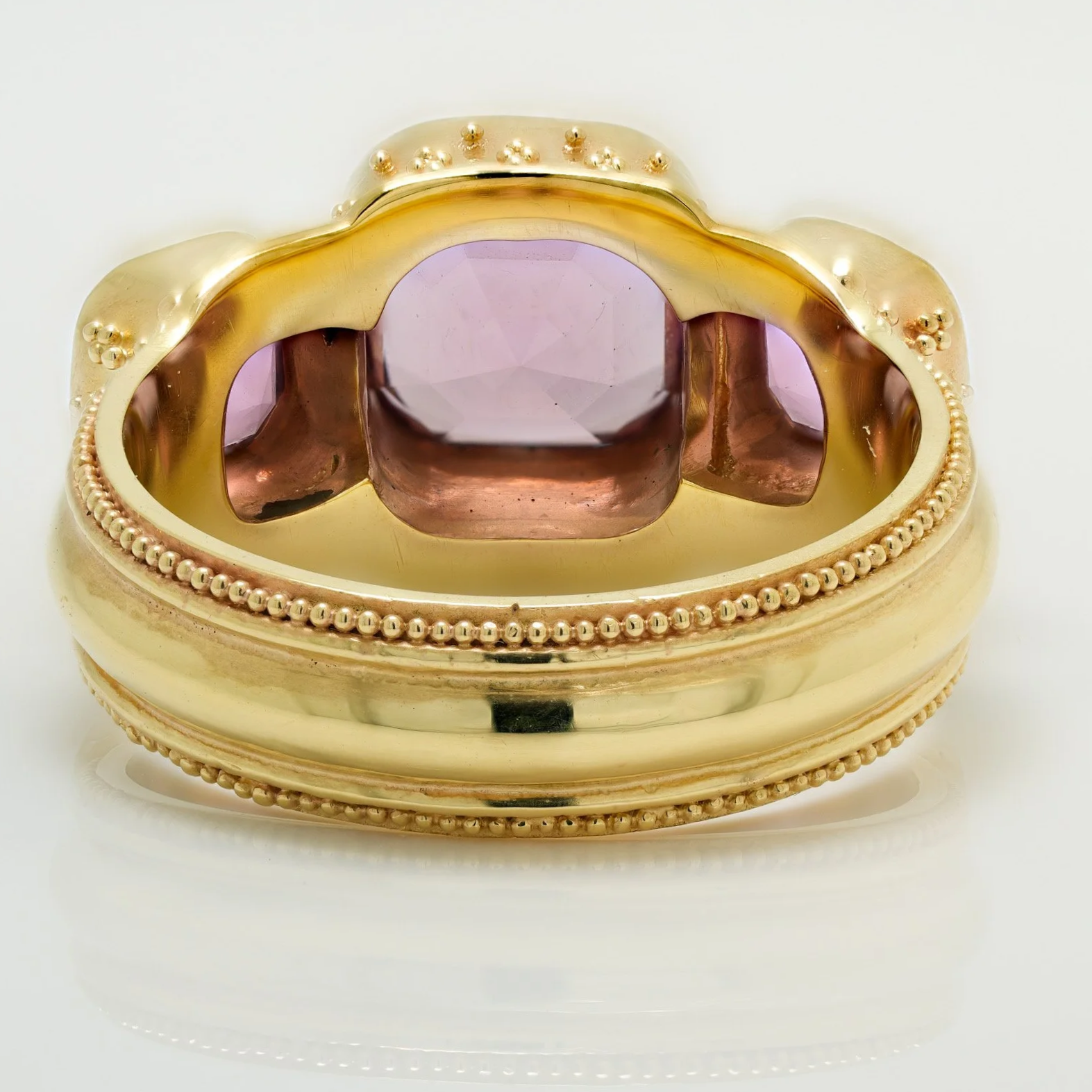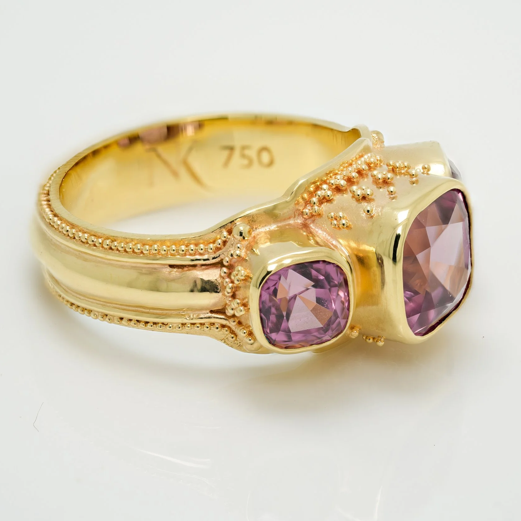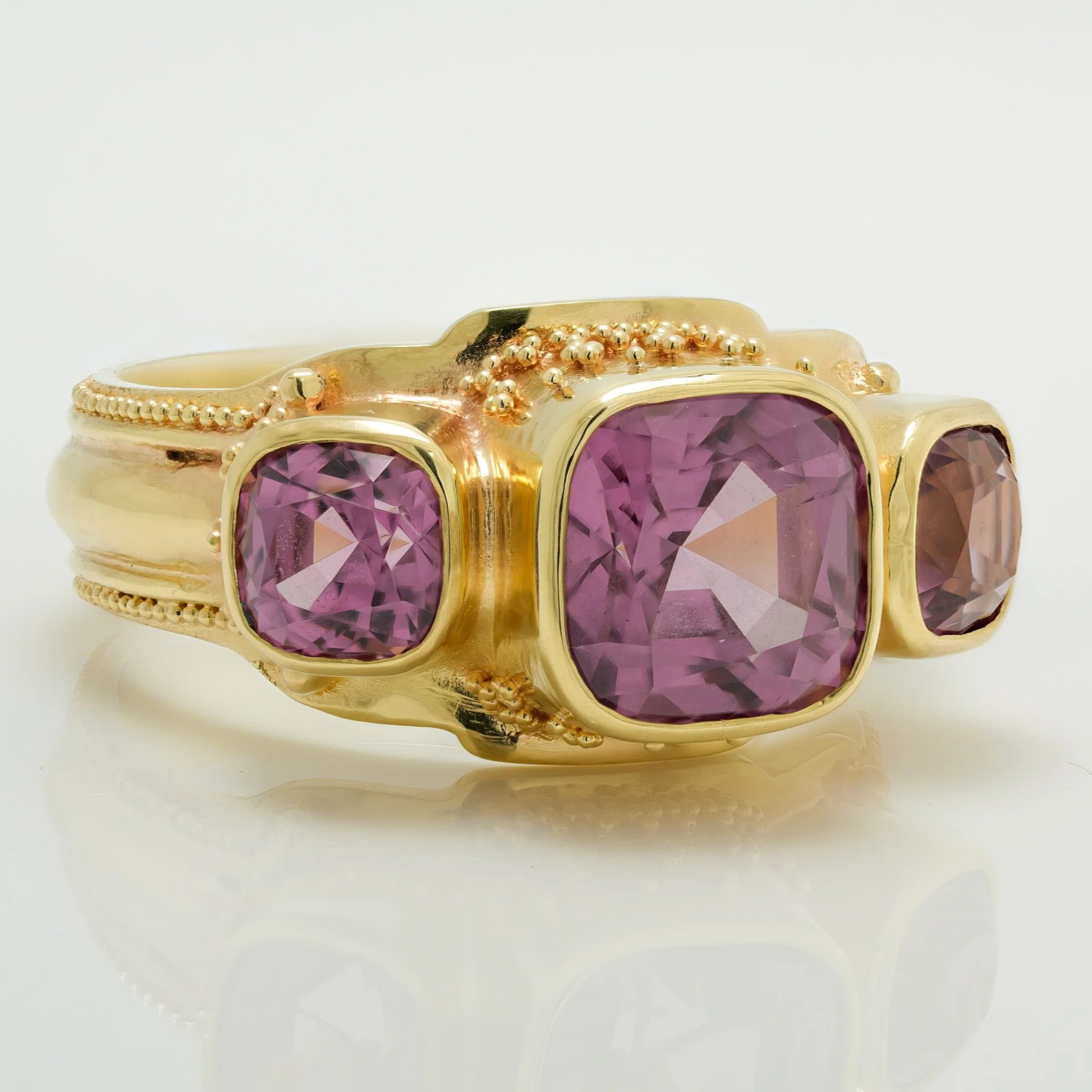Three Malaya garnets set in solid 18k gold, graduating in size across the finger.
