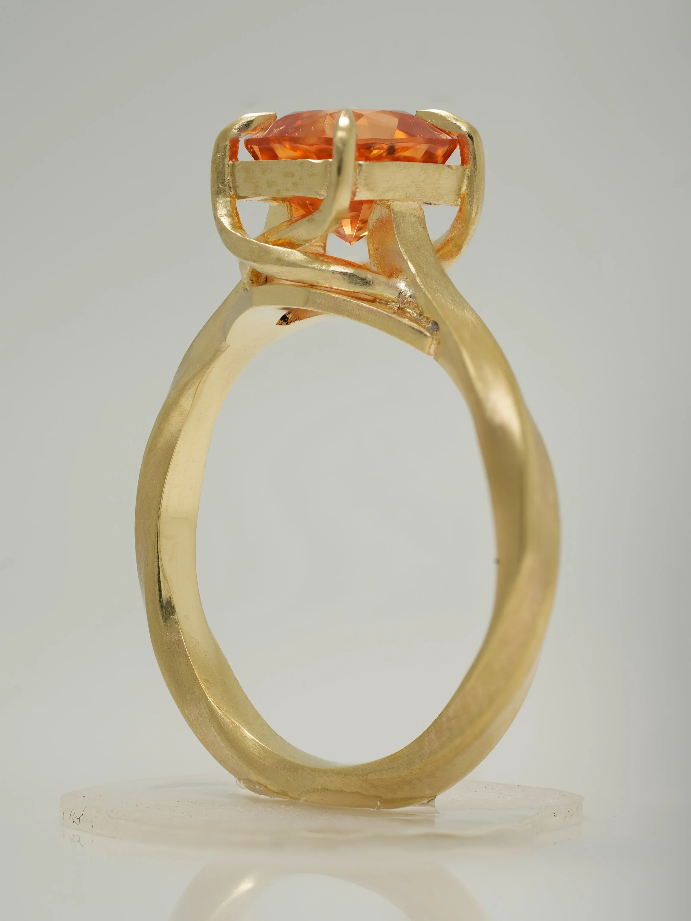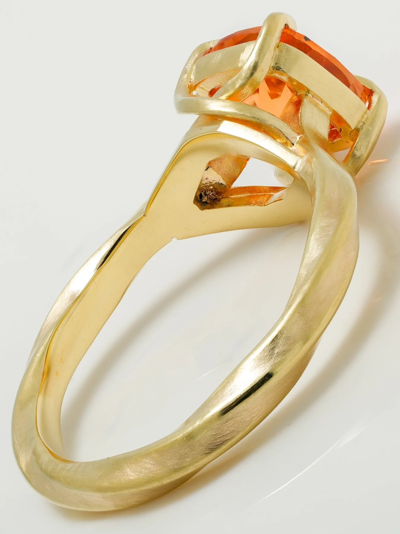 The twisted structure creates tension and flow, holding the stone while allowing light to pass freely around it.