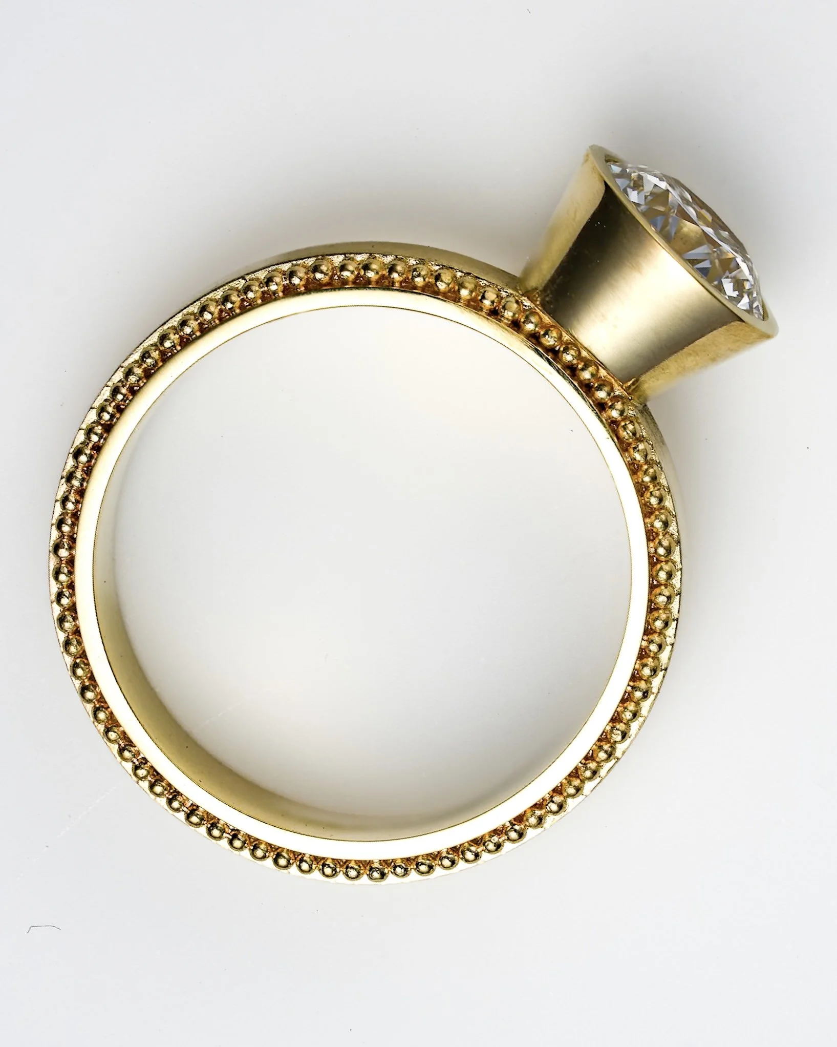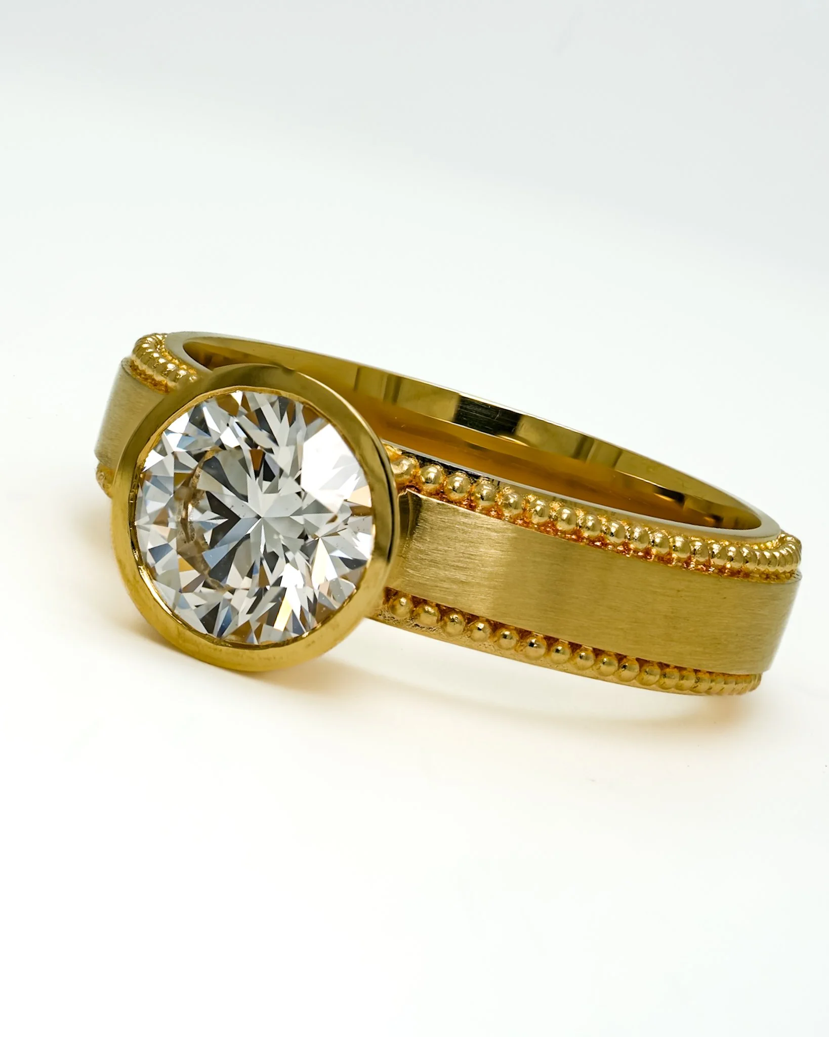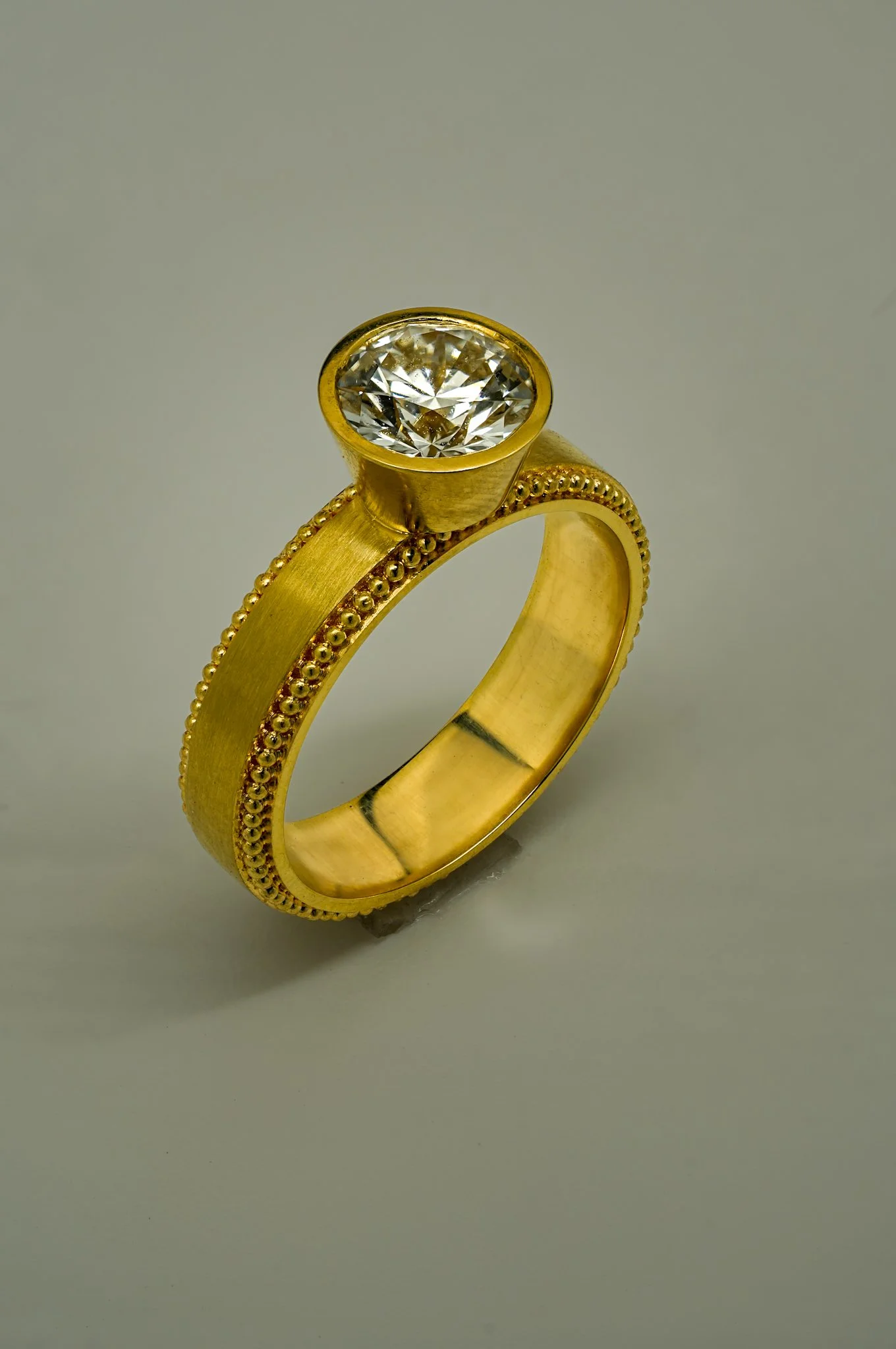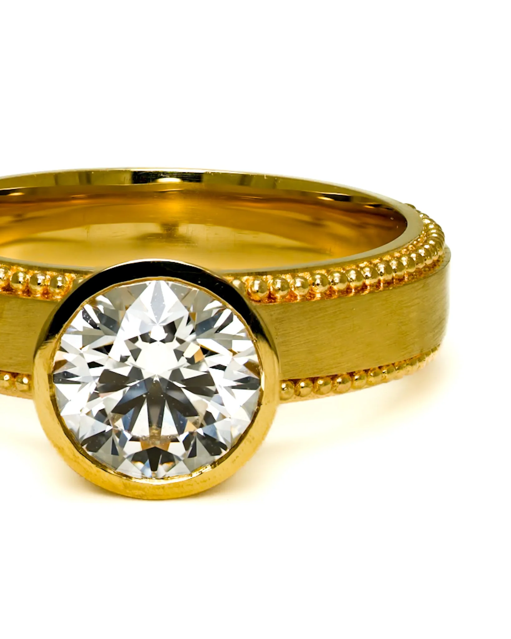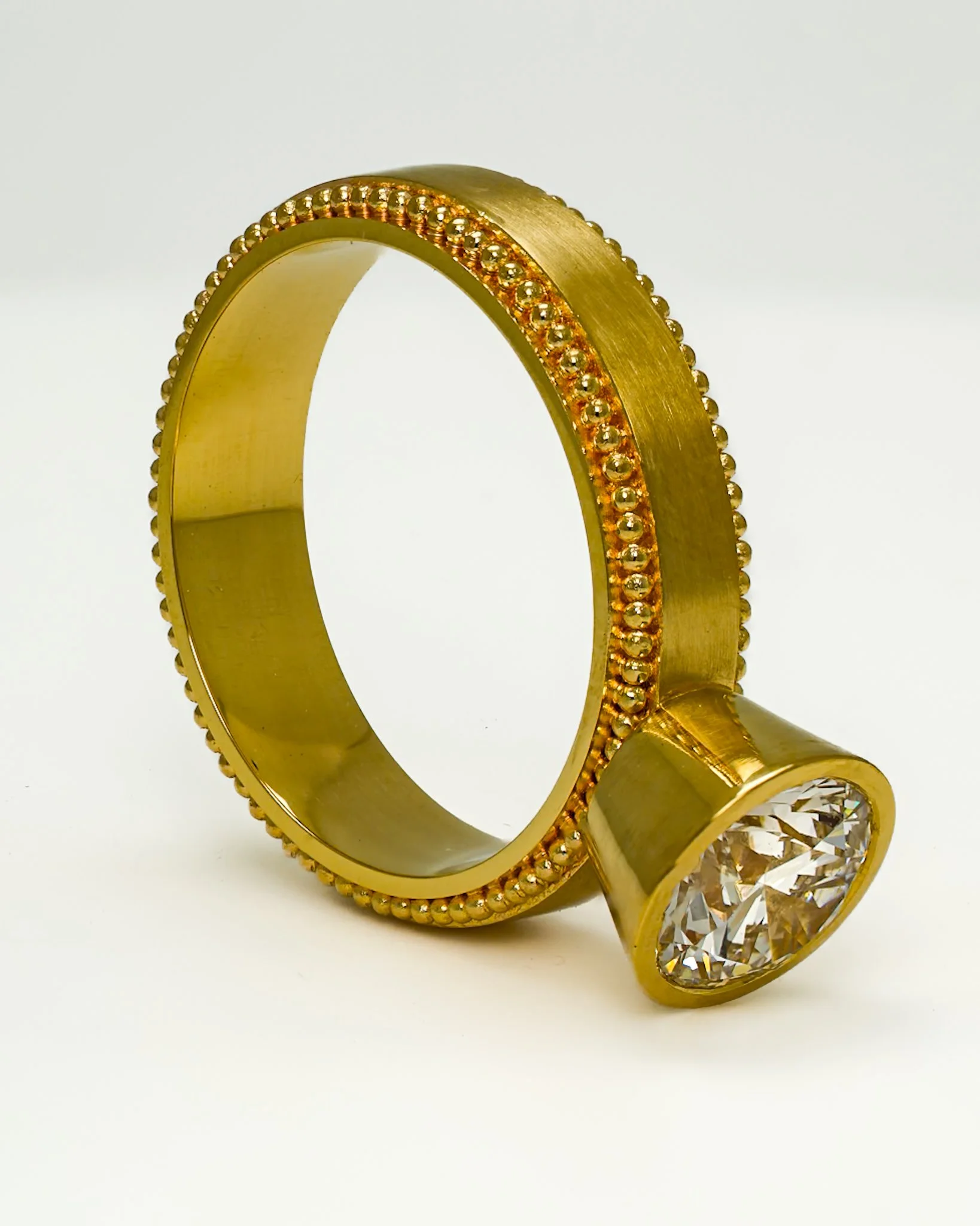 A single diamond marks a moment — held in a solid 18k gold bezel, rising cleanly from a satin-finished band framed by fine granulation.