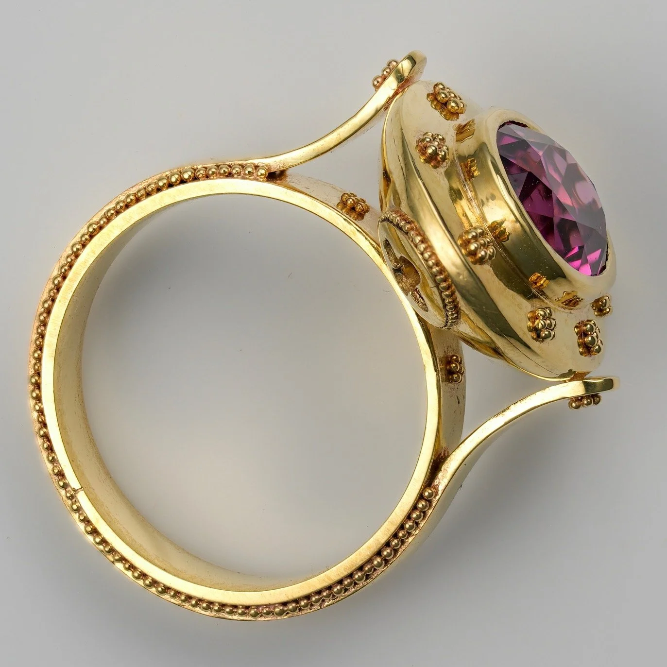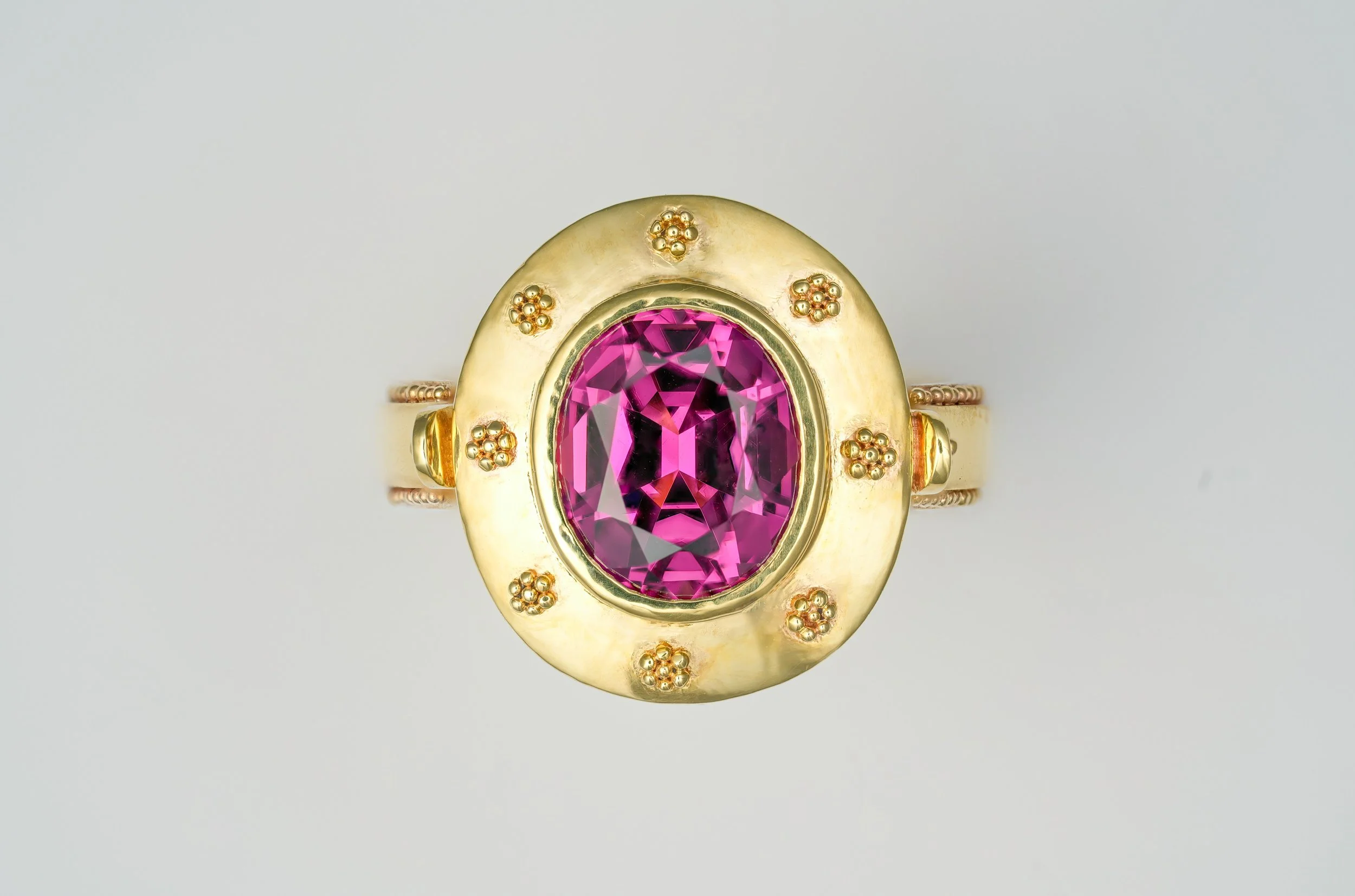 A vivid Tanga garnet set within a sculptural 18k gold crown.