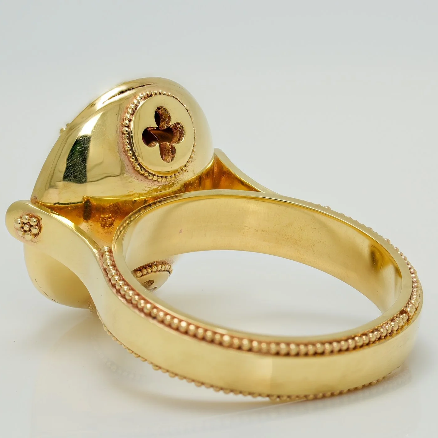 Beneath the setting, a quatrefoil oculus allows light to pass through the stone, revealing its full depth of colour.