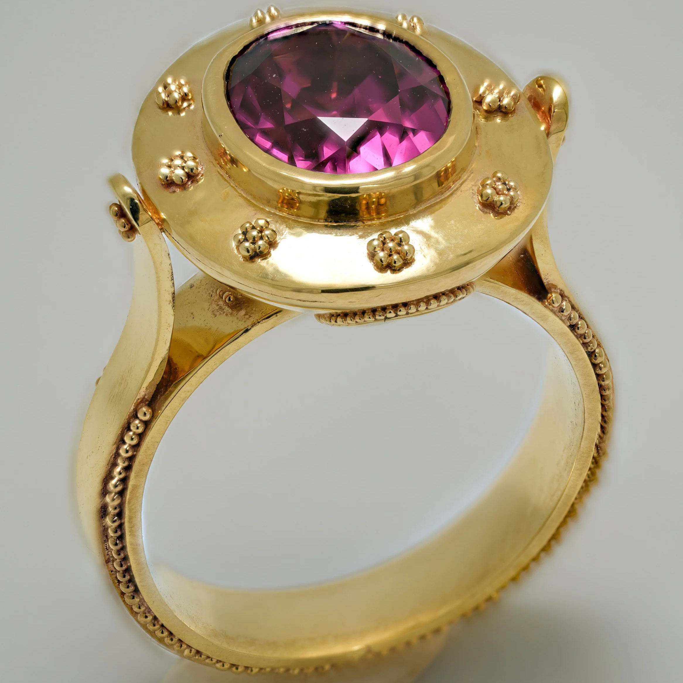 The elevated setting and open underside create a controlled flow of light through the stone, giving the garnet presence and depth beyond its size.